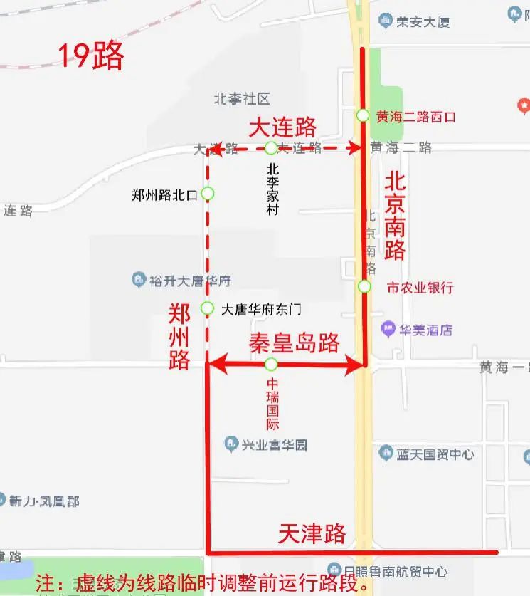 原運(yùn)行鄭州路(秦皇島路-大連路)、大連路(鄭州路-北京南路)路段停止運(yùn)行,臨時調(diào)整為秦皇島路(鄭州路-北京南路)、北京南路(秦皇島路-大連路)路段運(yùn)行。臨時撤銷“大唐華府東門、鄭州路北口、北李家村”站,臨時增設(shè)“中瑞國際、市農(nóng)業(yè)銀行”站。