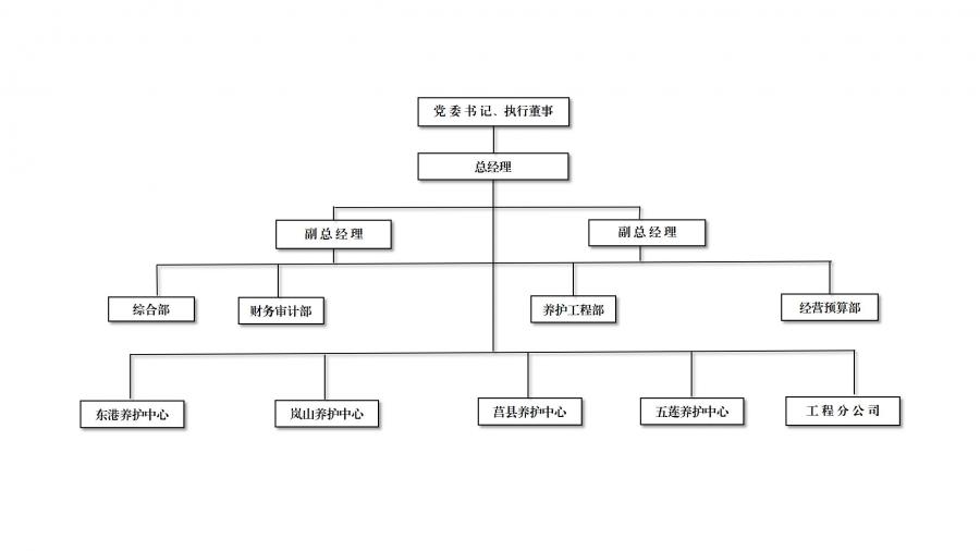 公司設(shè)綜合部、財(cái)務(wù)審計(jì)部、養(yǎng)護(hù)工程部、經(jīng)營預(yù)算部4個(gè)部室,東港、嵐山、莒縣和五蓮4個(gè)養(yǎng)護(hù)中心,1個(gè)工程分公司,1個(gè)綠化分公司,全市布設(shè)10個(gè)養(yǎng)護(hù)工區(qū)。