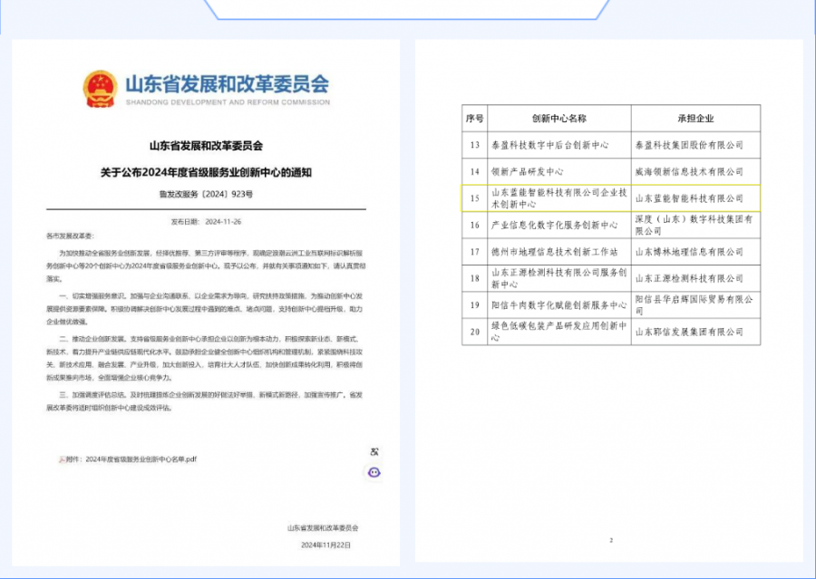 近日,山東省發(fā)展和改革委員會公布了2024年度省級服務(wù)業(yè)創(chuàng)新中心認(rèn)定結(jié)果,集團藍(lán)能科技公司技術(shù)創(chuàng)新中心成功入選。