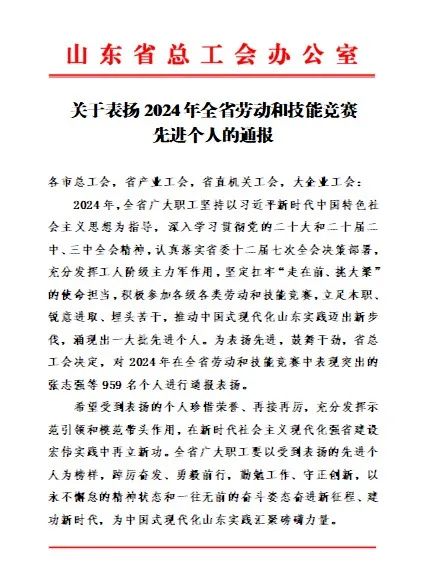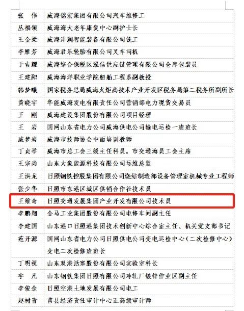 近日,山東省總工會(huì)公布了2024年全省勞動(dòng)和技能競(jìng)賽先進(jìn)個(gè)人名單,日照交通發(fā)展集團(tuán)產(chǎn)業(yè)開發(fā)有限公司技術(shù)員王維奇榮獲“全省勞動(dòng)和技能競(jìng)賽先進(jìn)個(gè)人”榮譽(yù)稱號(hào)。