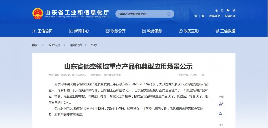 5月6日,山東省工信廳、省交通廳發(fā)布了山東省低空領(lǐng)域重點產(chǎn)品和典型應(yīng)用場景公示。據(jù)了解,為貫徹落實《山東省低空經(jīng)濟高質(zhì)量發(fā)展三年行動方案(2025-2027年)》,充分挖掘和展現(xiàn)低空領(lǐng)域的創(chuàng)新產(chǎn)品應(yīng)用,培育打造一批低空經(jīng)濟新標(biāo)桿,山東省工業(yè)和信息化廳、山東省交通運輸廳面向全省征集了一批低空領(lǐng)域產(chǎn)品和應(yīng)用場景,經(jīng)企業(yè)自愿申報、有關(guān)部門推薦、專家論證等程序,擬確定低空領(lǐng)域重點產(chǎn)品50個、典型應(yīng)用場景30個。此次公示時間自2025年5月6日至5月12日,共5個工作日。
