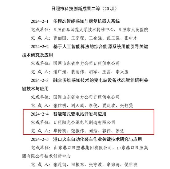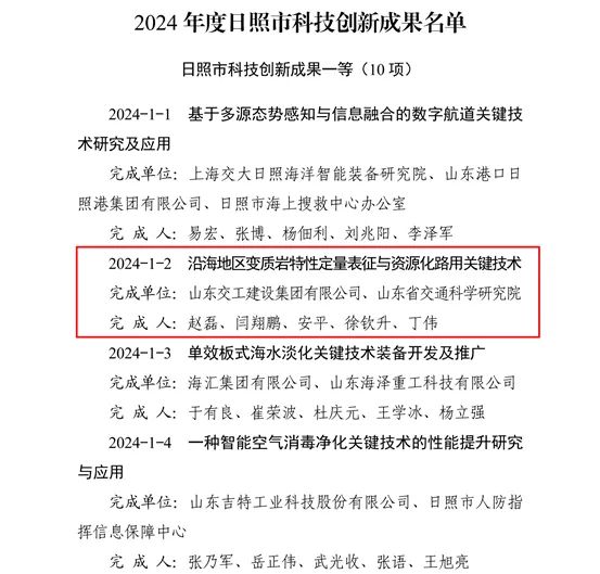近日,日照市政府公布了“2024年度日照市科技創(chuàng)新成果”名單。其中,山東交工建設集團“沿海地區(qū)變質(zhì)巖特性定量表征與資源化路用關鍵技術”獲得科創(chuàng)成果一等;陽光合源公司 “智能箱式變電站開發(fā)與應用”獲得科創(chuàng)成果二等。