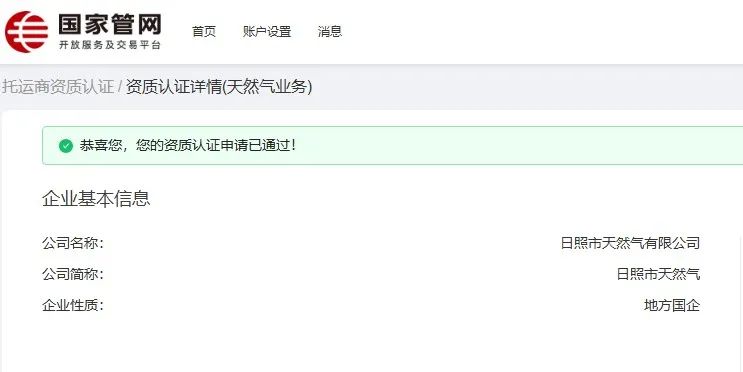 近日,集團所屬天然氣公司順利通過國家管網(wǎng)集團開放服務及交易平臺資質(zhì)認證,成功取得國家石油天然氣管網(wǎng)集團有限公司托運商資質(zhì),成為日照市首家具備全國范圍內(nèi)天然氣管道輸送資格的企業(yè) 。