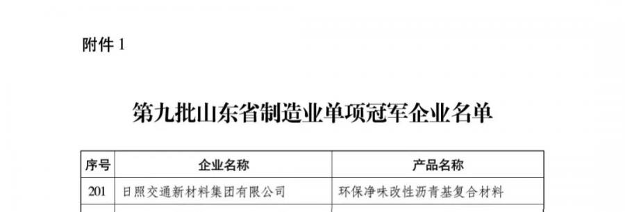 近日,省工信廳公布了第九批山東省制造業(yè)單項冠軍企業(yè)名單,新材料集團(tuán)憑借“環(huán)保凈味改性瀝青基復(fù)合材料”產(chǎn)品,榮獲“山東省制造業(yè)單項冠軍企業(yè)”稱號。