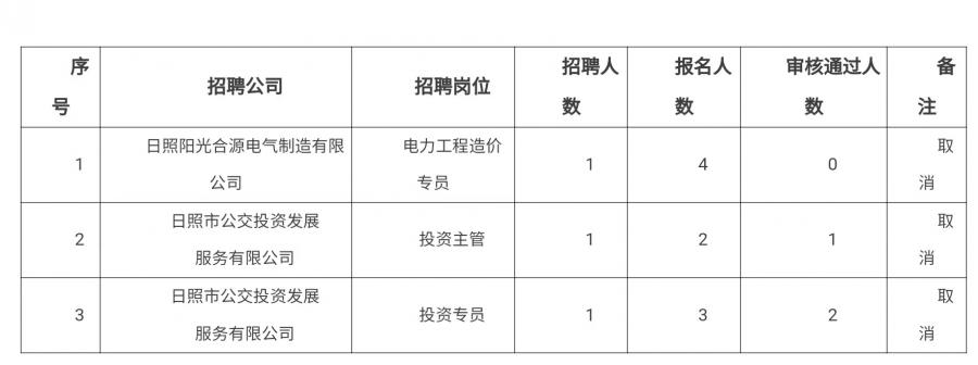 2022年日照交通能源發(fā)展集團(tuán)公開招聘報(bào)名、資格審核工作已于2022年8月26日結(jié)束。根據(jù)《日照交通能源發(fā)展集團(tuán)有限公司公開招聘工作人員簡(jiǎn)章》規(guī)定,若通過(guò)資格審核和業(yè)績(jī)?cè)u(píng)價(jià)人員不足崗位3倍的,取消或核減招聘崗位計(jì)劃?,F(xiàn)將取消招聘崗位情況予以計(jì)劃招聘人數(shù)公告。